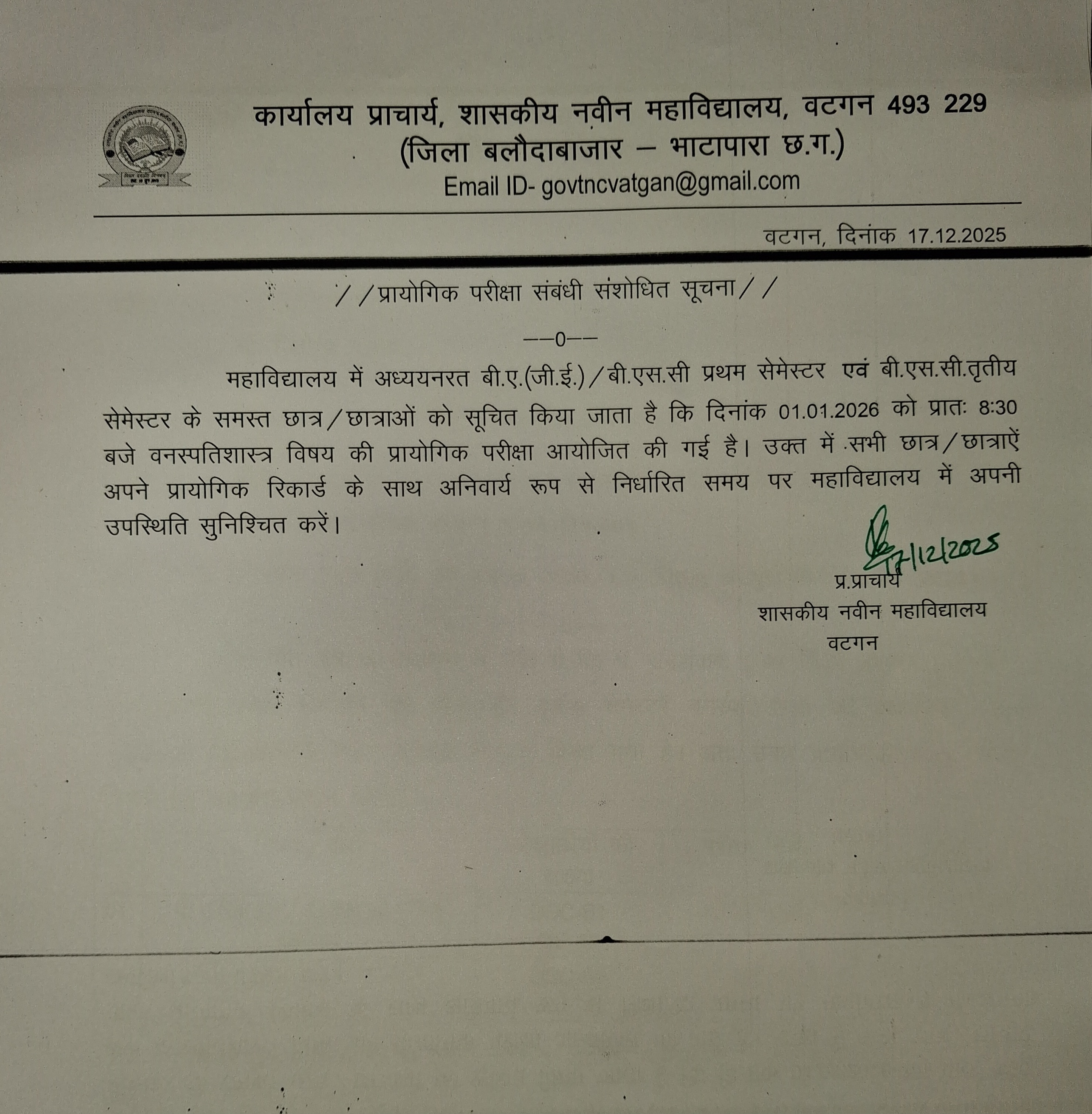 PRACTICAL EXAMINATION - BOTANY: DateL: 01.01.2026/Time: 8:30 AM onward