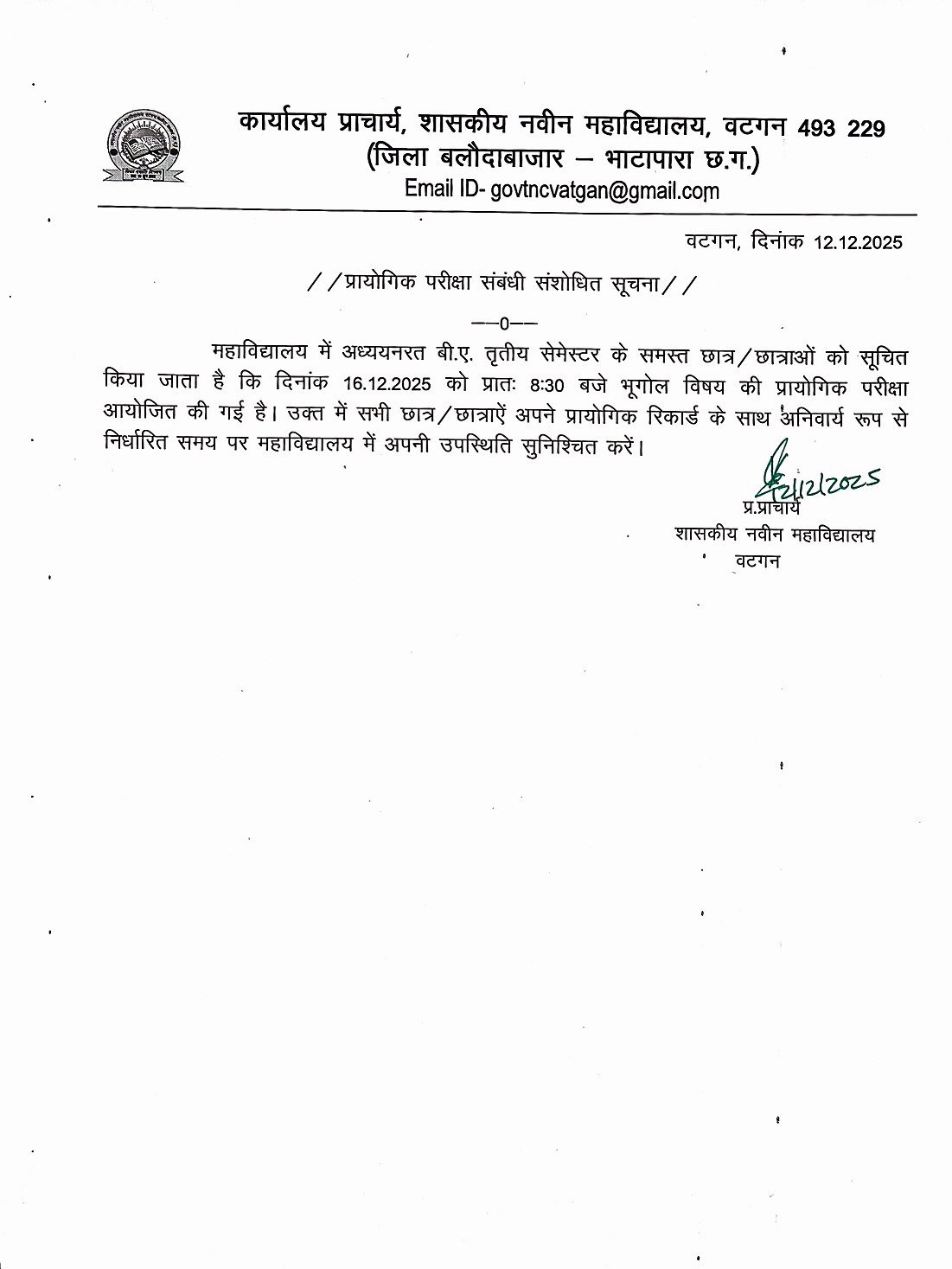 Notice: PRACTICAL EXAMINATION - GEOGRAPHY (B.A. III Semester) 2025-26